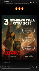 kebanggaan. Festival Film Indonesia 2025 telah mengumumkan daftar nomninasinya, puji syukur Film Qodrat 2 masuk ke dalam jajaran nominasi dengan meraih nominasi untuk 3 kategori, yaitu: “Penata Efek Visual Terbaik”, “Skenario Adaptasi Terbaik”, “Pemeran Utama Wanita Terbaik”